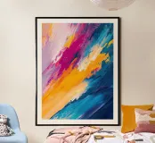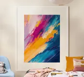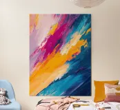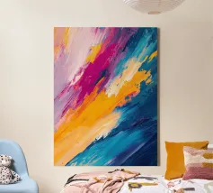 Una composizione astratta dinamica che esplode di colori vivaci e movimenti espressivi. Pennellate audaci di blu zaffiro, giallo dorato, magenta e lilla tenue si scontrano in un potente flusso diagonale, creando energia, profondità e ritmo visivo. Progettato per conferire vivacità e carattere contemporaneo agli interni moderni.
