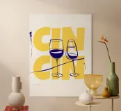 Due bicchieri da vino, uno riempito di vino rosso e l'altro di vino bianco, si trovano davanti a lettere gialle in grassetto che scrivono "CIN CIN". L'immagine suggerisce un brindisi celebrativo o un applauso.