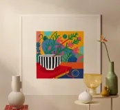 Una vivace natura morta astratta incentrata su una ciotola a righe bianche e nere, circondata da un tripudio di fiori, foglie e forme colorate.