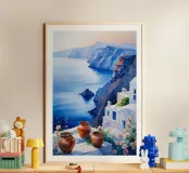 Questo squisito acquerello ritrae l'ipnotica caldera di Santorini, incorniciata da vasi di terracotta colmi di fiori colorati. Le scogliere frastagliate, dipinte in vibranti tonalità di arancio e marrone dorato, scendono nel sereno blu del Mar Egeo. Case imbiancate a calce e cappelle a cupola spuntano dai bordi, incarnando il fascino architettonico dell'isola. Il cielo dai toni pastello fa pensare a una mattina tranquilla o a un tramonto sereno, invitando gli spettatori in un paesaggio da sogno mediterraneo pieno di armonia naturale e artistica.