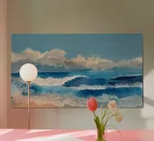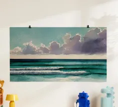 Una sognante miscela di nuvole soffici e blu vibranti crea un'ampia vista panoramica di cielo e mare. Il gioco di luci e colori è al tempo stesso arioso e solido.