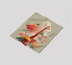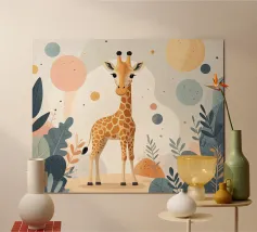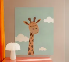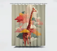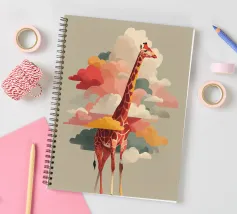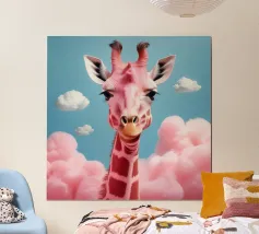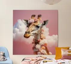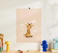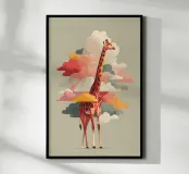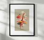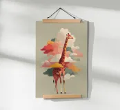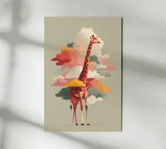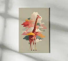 Un'illustrazione giocosa e sognante di un'alta giraffa che si erge su un cielo stravagante pieno di nuvole morbide e colorate. La palette di colori retro-moderni in rossi caldi, gialli e crema crea un'atmosfera serena e fantasiosa, perfetta per la stanza dei bambini o per uno spazio di lavoro creativo. Stampato in alta risoluzione per garantire dettagli e impatto visivo sorprendenti.
