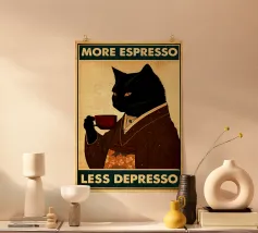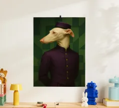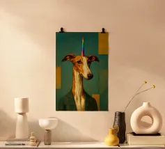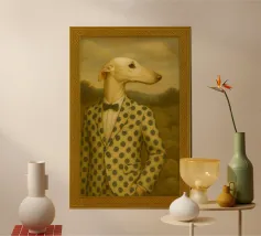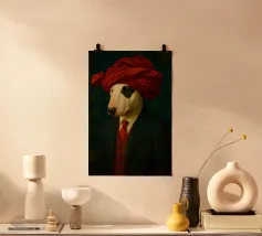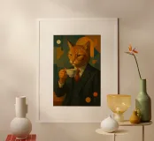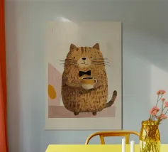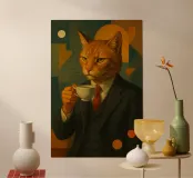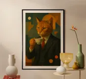 un gatto soriano vestito elegantemente che prende il suo tè (e se stesso) molto sul serio. Questo ritratto surreale bilancia l'eleganza con una strizzatina d'occhio all'assurdità: abito elegante, cravatta perfetta e la calma autorità di chi sa chiaramente più di voi. L'audace sfondo geometrico in ocra e blu conferisce al pezzo un tocco moderno e degno di una galleria, mentre il gatto stesso offre la giusta dose di fascino giocoso. Un'opera d'arte che trasforma l'assurdità quotidiana in eleganza, perfetta per chi ama l'arguzia, la raffinatezza e un po' di umorismo surreale sulle proprie pareti.