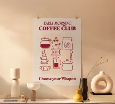 Un disegno minimalista mostra quattro strumenti vintage per la preparazione del caffè: un bollitore a collo d'oca, una caffettiera moka, un macinacaffè a manovella e un gocciolatore. Ogni strumento è illustrato con linee dettagliate su uno sfondo beige.