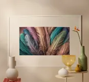 Un vivace assortimento di piume di diversi colori è disposto in modo creativo su una superficie piana, mettendo in risalto le loro forme uniche e le loro morbide trame. L'esposizione mette in risalto l'estro artistico.