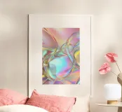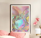 Abstraktes, farbenfrohes Kunstwerk mit weichen, fließenden Formen, die an schillernde Blasen erinnern. Das Design zeichnet sich durch eine weiche, pastellfarbene Farbpalette aus, bei der Schattierungen von Rosa, Lila, Blau und Gelb nahtlos ineinander übergehen. Das Bild erweckt ein traumhaftes, futuristisches Gefühl mit seinen durchscheinenden, glänzenden Oberflächen und einer sanften Beleuchtung, die einen schimmernden, ätherischen Effekt erzeugt. Diese digitale Komposition ist perfekt für Liebhaber moderner Kunst und fängt die Essenz von Minimalismus und zeitgenössischem Design ein.