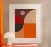 Una composizione geometrica audace e poetica, ispirata al design del Mid-Century Modern e del Bauhaus. Caratterizzata da un mix di forme arrotondate e angolari nei colori rosso intenso, marrone caldo, arancione bruciato, blu scuro, abbronzatura e rosa tenue con una sottile trama di lino. Questa armoniosa miscela di forme e colori crea una dichiarazione di fiducia ed elevazione, perfetta per illuminare le pareti con moderna eleganza e armonia. Parte di un duo per un impatto visivo ancora più forte.