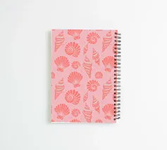 Sognante motivo di spiaggia costiera con conchiglie e nautilus variegati di colore corallo, su uno sfondo corallo pastello.