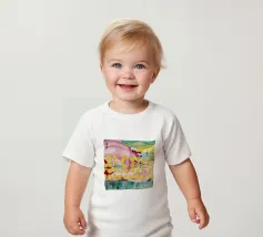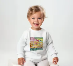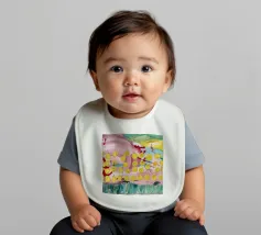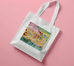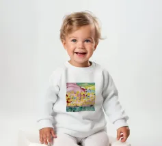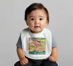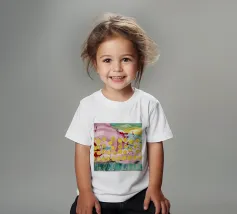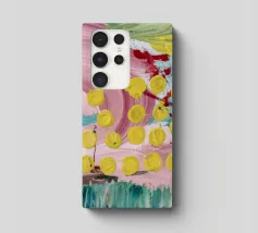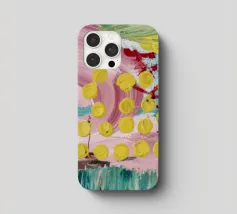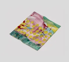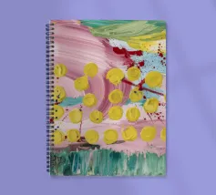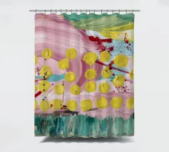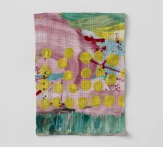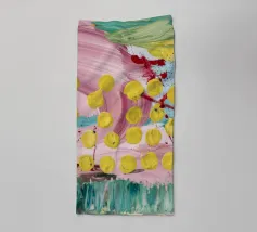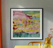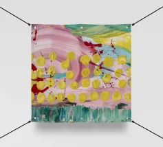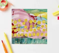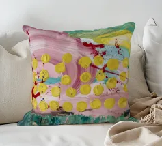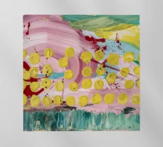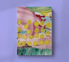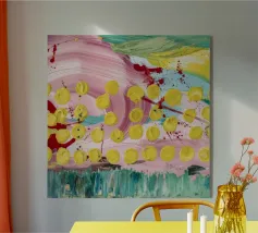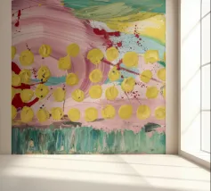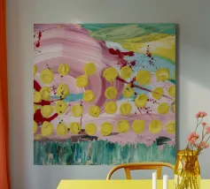 A joyful abstract painting with a light pink and white background, showered with vibrant yellow, pink, and green dots and splatters resembling confetti or a bloom of colorful particles.