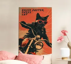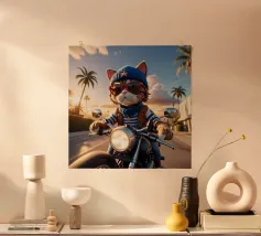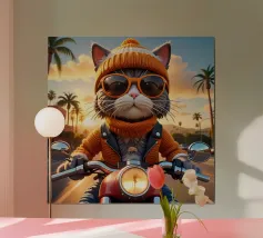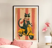 Un gatto antropomorfo elegante e sicuro di sé, che indossa una sciarpa di seta e una giacca di pelle, guida un elegante scooter con un atteggiamento cool. L'immagine vibrante e colorata evoca un senso di avventura e carisma, mescolando elementi di moda, divertimento e libertà. Questa opera d'arte cattura l'essenza di uno stile di vita moderno e alla moda con un tocco giocoso e sicuro.