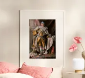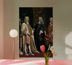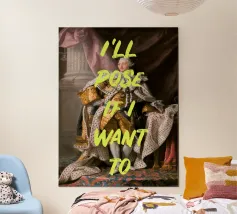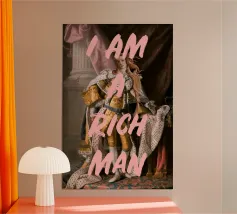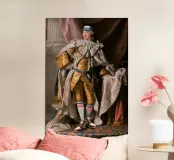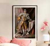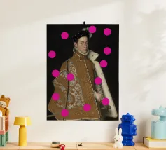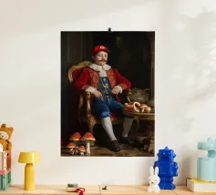 "Cool King porta la regalità a un livello completamente nuovo. Questo intelligente collage neopop reimmagina i classici ritratti reali con un tocco di ironia e molto surrealismo. Sfoggiando l'ultima moda urbana, questo monarca umoristico non è solo pronto a governare il suo regno, ma anche la scena della moda urbana!".