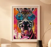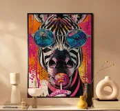 Una vivace immagine in stile pop art presenta una zebra che indossa occhiali da sole rotondi e riflettenti e si gode un lecca-lecca colorato. Le strisce bianche e nere della zebra sono accentuate da spruzzi di rosa, arancione e blu. Gli occhiali da sole riflettono forme e motivi astratti, aggiungendo un effetto surreale. Lo sfondo è un mix di schizzi e gocce in colori vivaci e contrastanti.