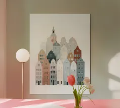 Questa immagine mostra la colorata architettura degli edifici storici di Copenhagen in uno stile moderno e geometrico. Perfetta per aggiungere un tocco di fascino scandinavo al vostro spazio.