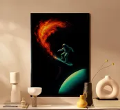 Questa opera d'arte vibrante e dinamica cattura il brivido di un'avventura cosmica, raffigurando un astronauta che surfa senza paura su una tavola elegante attraverso la vastità dello spazio. Una nebulosa arancione e rossa mozzafiato vortica drammaticamente dietro di loro, mentre un pianeta verde acqua freddo e incandescente curva verso il basso. Questo design fantasioso combina la libertà del surf con la maestosità del cosmo, creando una scena unica ed energica. È una scelta fantastica per chi ama lo spazio, gli sport estremi, la fantasia o l'arte che si spinge oltre i confini dell'immaginazione.