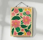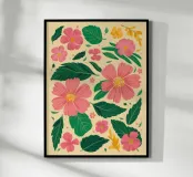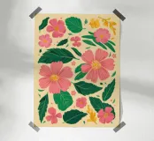 Un affascinante motivo di semplici fiori di cosmo rosa con foglie verdi su uno sfondo color crema. Lo stile è fresco e delicato, con un'atmosfera dolce e botanica.
