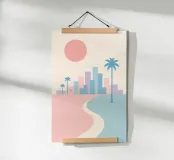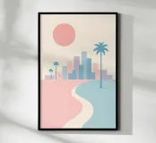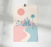 Un'ambientazione californiana stilizzata all'estremo: sagome di grattacieli, esili palme, una spiaggia rosa cipria e morbide curve in una composizione minimalista e pastello. Un poster chic e rilassante, perfetto per un tocco delicato della West Coast.