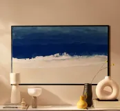 Un paesaggio marino minimalista espresso attraverso i toni dell'indaco profondo e della sabbia chiara, dove pennellate fluide evocano l'orizzonte e il morbido rollio delle onde. La fusione delle tonalità suggerisce nebbia, profondità e calma, catturando il ritmo tranquillo tra l'oceano e la riva.