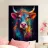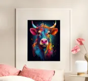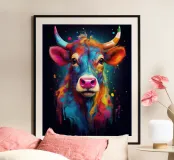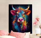 Un'impressionante pittura digitale di una mucca caratterizzata da colori vivaci e audaci che si fondono perfettamente con un effetto di schizzi di vernice. La resa artistica combina realismo e astrazione, creando una composizione surreale e accattivante su uno sfondo scuro.