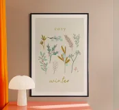 Un'illustrazione per la stagione invernale! Leggera e ventilata, questa immagine d'atmosfera con foglie e rami e il testo "accogliente inverno".