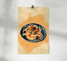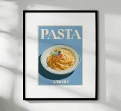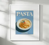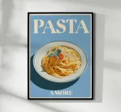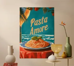 "Pasta Amore" celebra l'amore per la cucina italiana con un elegante piatto di spaghetti su sfondo azzurro. Pomodori freschi ed erbe aromatiche conferiscono al disegno un tocco mediterraneo, mentre le scritte bianche sottolineano la passione culinaria. Ideale per ogni cucina che celebra il cibo!