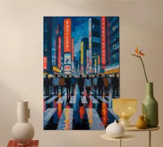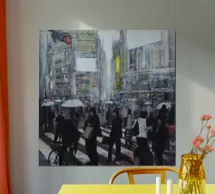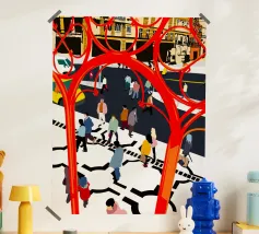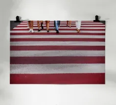 Questa opera d'arte contemporanea dall'alto trasforma un quotidiano passaggio pedonale cittadino in una suggestiva composizione astratta. Audaci strisce bianche tagliano la superficie dell'asfalto, mentre piccole figure umane dai colori vivaci si muovono indipendentemente attraverso l'inquadratura, proiettando ombre allungate. Il contrasto tra la rigida geometria e il movimento organico esplora i temi del ritmo, dell'anonimato e dell'esperienza urbana condivisa. Le texture pittoriche ammorbidiscono la scena, sfumando il confine tra realismo e astrazione. Ideale per interni moderni, spazi architettonici o collezioni incentrate sulla vita cittadina e sui modelli umani.