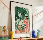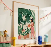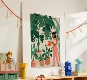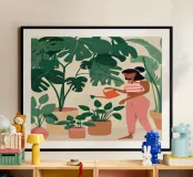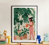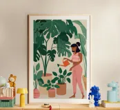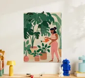 Illustrazione di una donna che si occupa teneramente delle sue piante da appartamento. La scena è una rappresentazione pacifica, nutriente e commovente della gioia tranquilla che si prova nel prendersi cura di un giardino interno.