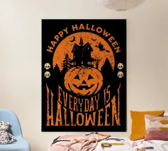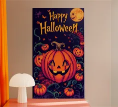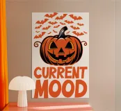 Una zucca con un sorriso intagliato è circondata da pipistrelli volanti, che catturano l'atmosfera divertente di Halloween. Le parole "CURRENT MOOD" sono in grassetto e spiccano sotto la zucca.