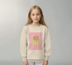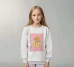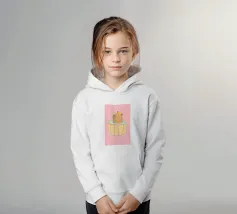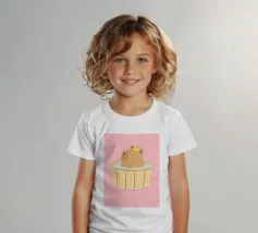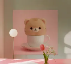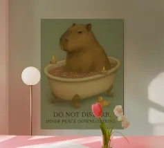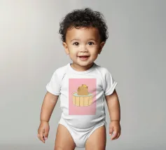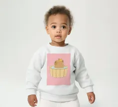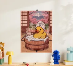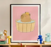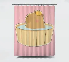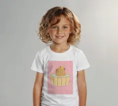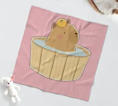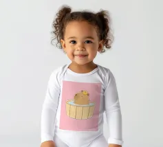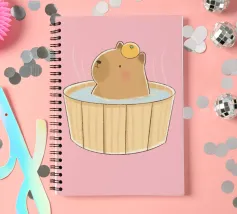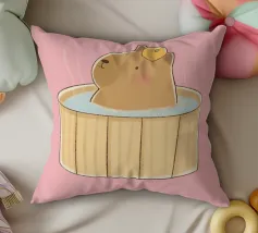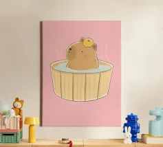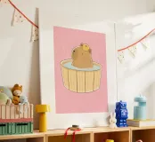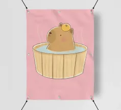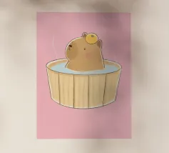 Un simpatico orso si rilassa in una vasca di legno piena d'acqua, sormontata da un piccolo frutto giallo. La scena è ambientata su un semplice sfondo rosa, con il vapore che sale a indicare il calore.