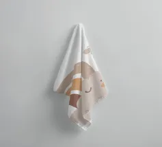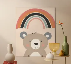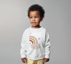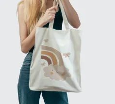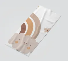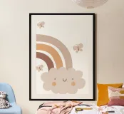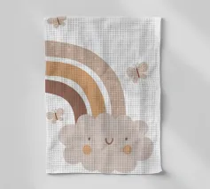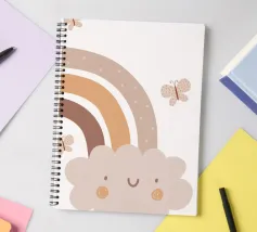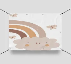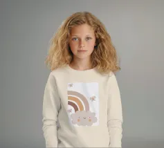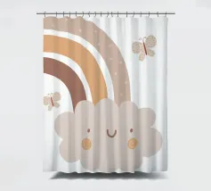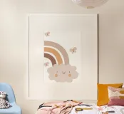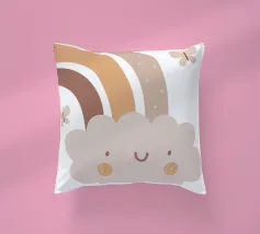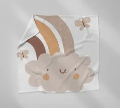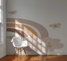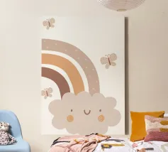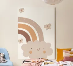 A cute, smiling cloud sits beneath a pastel rainbow, accompanied by three fluttering butterflies. The soft color palette creates a warm and whimsical atmosphere.