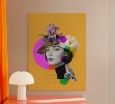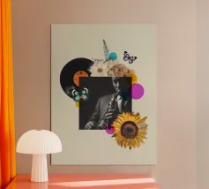 Una nostalgica stampa d'arte a collage che unisce fascino vintage e romanticismo. Un grammofono ornato esplode di fiori vivaci e dischi in vinile, mentre una coppia che balla cattura la magia della musica senza tempo. Un'opera d'arte da parete perfetta per gli amanti della musica, per gli appassionati di arredamento retrò o per chiunque sia attratto dalla narrazione di storie sentimentali attraverso il design.
