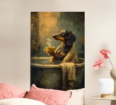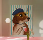 Illustrazione stravagante di un cane marrone che indossa un berretto a righe bianche e blu e occhiali rotondi, sorseggiando con calma da una tazza di caffè, emanando un fascino fresco, sofisticato e spiritoso su uno sfondo blu chiaro con linee di vapore.