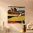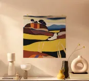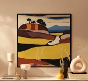 Colori vivaci e forme astratte formano una scena di paesaggio, con strati distinti che rappresentano il terreno e il cielo. La parte superiore è caratterizzata da alberi stagliati su uno sfondo con dolci sfumature, che suggerisce una lontana catena montuosa sotto un cielo crepuscolare.