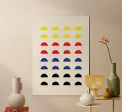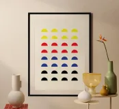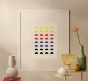 Uno straordinario poster digitale che riprende i principi minimalisti e geometrici di De Stijl e del Bauhaus. Il design è caratterizzato da una griglia precisa di semicerchi disposti in colonne verticali e righe orizzontali. I colori sono rigorosamente limitati ai colori primari, giallo, rosso e blu, oltre al nero, su un sottile sfondo bianco sporco. Questa composizione ritmica e strutturata offre un'estetica pulita, audace e moderna. Questo download digitale di alta qualità vanta 7000x5000 pixel a 300 dpi, garantendo una chiarezza eccezionale e una qualità di stampa superiore per l'arte di grande formato.