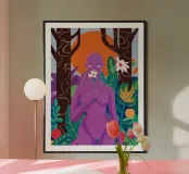 Un ritratto surreale di una donna dalla pelle viola, che rappresenta una dea della natura, circondata da fiori e piante sotto una luna crescente. L'opera è mistica, potente e una splendida celebrazione dell'energia femminile e della natura.
