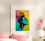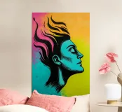 Un ritratto laterale con pelle blu ciano si staglia su uno sfondo vibrante. I capelli si trasformano in linee nere fluenti che sfumano in tonalità infuocate di giallo, rosa e arancione. Lo sfondo mescola delicatamente il turchese con il giallo caldo e il rosa, creando una dinamica ad alto contrasto. L'illustrazione appare espressiva e moderna, quasi un misto di street art ed espressionismo digitale.