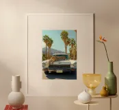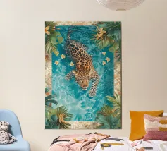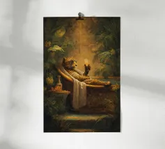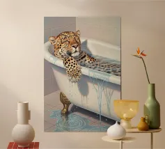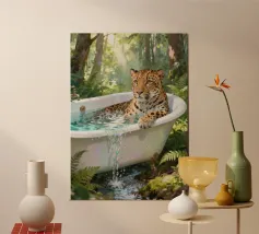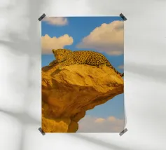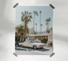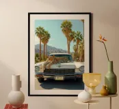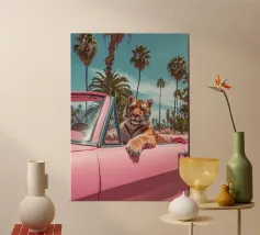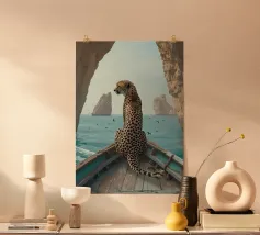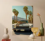 Una scena del deserto inondata di sole, con un leopardo rilassato che si adagia sul cofano di una Cadillac bianca d'epoca, circondato da alte palme e da un'aspra vista sulle montagne. Questo mix surreale di fauna selvatica e retroamericanità crea un'immagine di grande impatto, audace e rilassata al tempo stesso. Perfetto per gli amanti del lusso, dei viaggi su strada, delle vibrazioni del deserto e dell'eleganza selvaggia.