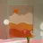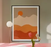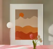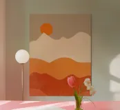 Minimalist layered mountain art in warm orange sunset tones.