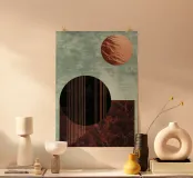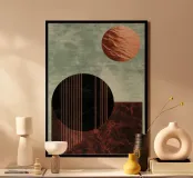 Design astratto e minimalista con forme geometriche in marrone, verde menta, rame e nero. Un grande cerchio di rame a sinistra, linee verticali sottili e superfici strutturate ricordano la pietra o il marmo. Disposte in modo armonico con un'estetica moderna e chiara.