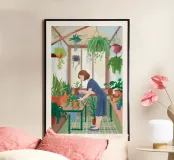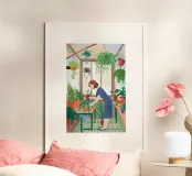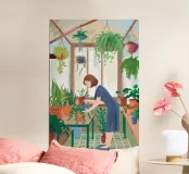 Una donna si inginocchia tra le rigogliose piante pendenti di una serra, completamente assorta in un rituale dolce e vivificante.