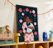 Una madre che tiene in braccio il suo bambino è circondata da grandi fiori in fiore. Il calore e la tenerezza del legame sono splendidamente evidenziati.