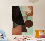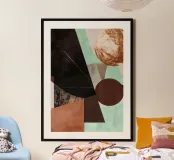 Collage digitale di forme geometriche in marrone, verde menta e nero. I toni della terra come il rame, l'oro rosa e il grigio scuro completano il design. Elementi in carta strutturata e materiali naturali come il legno e la pietra creano un'atmosfera elegante con luci soffuse.