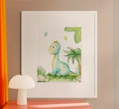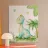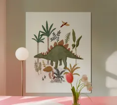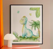 Un simpatico dinosauro blu con pelle maculata siede allegramente su uno sfondo lussureggiante con palme e farfalle. L'ambientazione è luminosa e giocosa e fonde elementi della natura con uno stile stravagante e cartoonesco.
