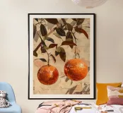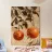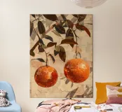 Una composizione giocosa ma raffinata con due arance trasformate in sfere da discoteca, appese a un ramo frondoso su uno sfondo di muro leggermente consumato dal tempo. Toni caldi, riflessi delicati e texture naturali creano un contrasto equilibrato tra forme organiche e scintillio grafico. Un'opera d'arte contemporanea che aggiunge umorismo, calore e interesse visivo agli interni moderni.
