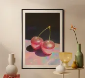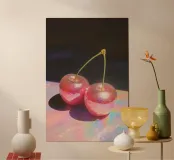 Un'immagine di grande impatto visivo di due ciliegie progettate per assomigliare a palle da discoteca, che riflettono modelli di luce vibranti e colorati.