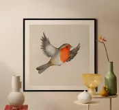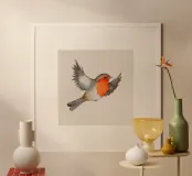 Disegno ad acquerello di un pettirosso in volo. Ha entrambe le ali alzate. Penso che i pettirossi siano degli uccellini molto carini, con il loro petto rosso e i grandi occhi scuri. Sono anche sempre piuttosto sfacciati e a volte ci si può avvicinare a loro, non sono particolarmente timorosi nonostante le loro dimensioni.