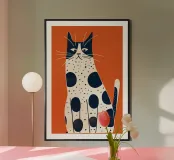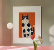 Un gatto maculato davanti a un caldo colore arancione: minimalismo ridotto, massimo fascino. Ricorda il design scandinavo degli anni '50 e la grafica iconica di Saul Bass. La riduzione geometrica e la tavolozza di colori caldi creano un'atmosfera accogliente. Perfetto per gli amanti dell'illustrazione senza tempo, alla ricerca di personalità senza kitsch. Un'opera d'arte che unisce la chiarezza scandinava a un'eleganza giocosa, ideale per gli amanti dei gatti moderni con stile.