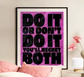 "Il testo nero in grassetto 'Fallo o non farlo, ti pentirai di entrambe le cose' è disposto in modo sovrapposto su uno sfondo rosa vibrante di carta stropicciata e trasmette un senso di urgenza e di riflessione esistenziale",