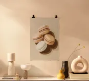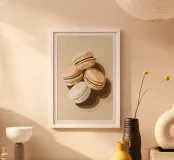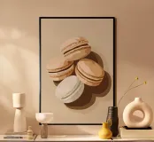 Questa elegante illustrazione di dolci macarons nei toni morbidi del beige e del marrone dona un tocco di pasticceria francese a qualsiasi cucina moderna. Ideale per gli amanti dei dolci e dell'arte minimalista.