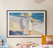 Due donne in abito bianco e cappello da sole passeggiano in riva all'oceano, catturando un sereno momento estivo con pennellate morbide e impressionistiche.
