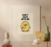 Un'esuberante anatra dei cartoni animati si erge con aria di sfida, indossando occhiali da sole e assumendo una posa da duro. Il testo in grassetto in stile graffiti recita "Don't Duck With Me", con spruzzi d'acqua e vivaci colori urbani.